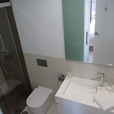 L’appartement de 70 m² se compose de: vaste séjour/salle à manger avec cuisine ouverte, buanderie, 1 chambre double avec 1ere salle de bains (douche, lavabo et toilette) et terrasse arrière, 2ème salle de bains avec douche, lavabo et toilette, 1 chambre avec 2 lits simples (+ 1 lit supplémentaire dans le tiroir). La vaste terrasse avant (20 m²) est aménagée d’une table et de 6 chaises ainsi que d’un confortable salon de jardin pour 5 personnes.